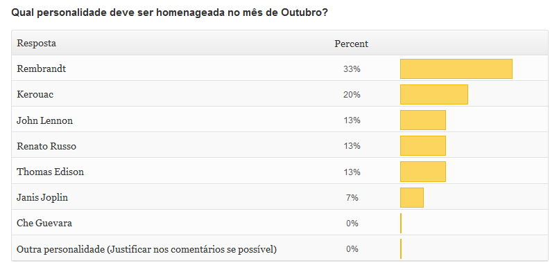 Vocês escolheram e nós faremos, o homenageado do mês de Outubro escolhido por vocês foi…(tan tan tan tan…) Ok, sem mais delongas, sem essa de chamar o comercial para divulgar o resultado e ficar enrolando, vamos logo ao que interessa! O vencedor desse mês com 33% dos votos foi o Rembrandt, uma salva de palmas (clap clap clap…)
