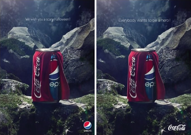 Coca-cola e Pepsi, duas gigantes do mercado de refrigerante (se estendendo para sucos, chás e energéticos) já se provocaram publicamente em suas campanhas, e renderam imagens e vídeos publicitários incríveis aos admiradores. 31 de outubro, Halloween, e a Pepsi lança uma peça publicitária, bem instigadora. O motivo? A ousadia da marca ao colocar uma capa transformando-se em sua concorrente Coca-cola com a seguinte descrição: ““Desejamos-lhes um Halloween assustador”.