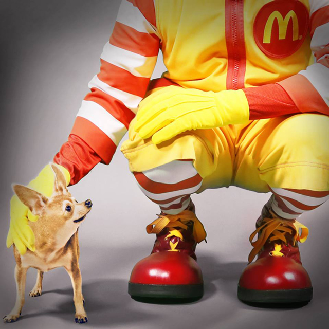 Com a imagem veio a frase “A imitação é a forma mais sincera de adulação”, em que o famoso palhaço acaricia um Chihuahua, que já foi representado como mascote da Taco Bells.
